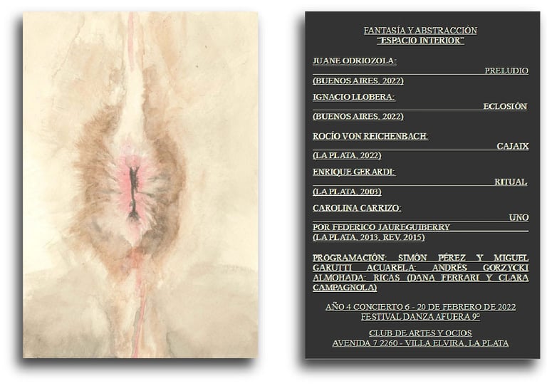 FANTASÍA Y ABSTRACCIÓN "ESPACIO INTERIOR" CON OBRAS DE JUANE ODRIOZOLA (PRELUDIO, BUENOS AIRES, 2022), IGNACIO LLOBERA (ECLOSIÓN, BUENOS AIRES, 2022), LUCA VON REICHENBACH (CAJAIX, LA PLATA, 2022), ENRIQUE GERARDI (RITUAL, LA PLATA, 2003), CAROLINA CARRIZO (UNO, LA PLATA, 2013, REV. 2015), EN SAXO: FEDERICO JAUREGUIBERRY. PROGRAMACIÓN DE SIMÓN PÉREZ Y MIGUEL GARUTTI, ACUARELA DE ANDRÉS GORZYCKI, ALMOHADA DE RICAS (DANA FERRARI Y CLARA CAMPAGNOLA). AÑO 4. CONCIERTO 6. 20 DE FEBRERO DE 2022. FESTIVAL DANZA AFUERA 9. CLUB DE ARTES Y OCIOS. AVENIDA 7 2260. VILLA ELVIRA, LA PLATA.