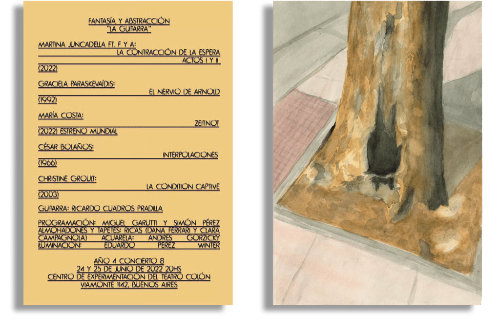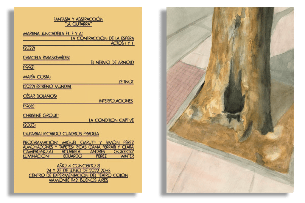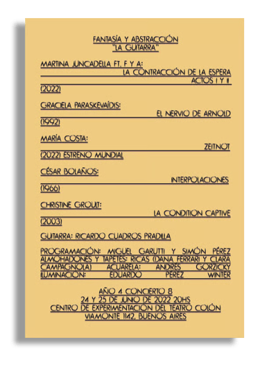 FANTASÍA Y ABSTRACCIÓN "LA GUITARRA" CON OBRAS DE MARTINA JUNCADELLA FT. F Y A (LA CONTRACCIÓN DE LA ESPERA, ACTOS I Y II, 2022), GRACIELA PARASKEVAÍDIS (EL NERVIO DE ARNOLD, 1992), MARÍA COSTA (ZEINOT, 2022, ESTRENO MUNDIAL), CÉSAR BOLAÑOS (INTERPOLACIONES, 1966), CHRISTINE GROULT (LA CONDITION CAPTIVE, 2003). EN GUITARRA: RICARDO CUADROS PRADILLA, EN DIFUSIÓN ACUSMÁTICA: MARÍA COSTA, MIGUEL GARUTTI Y SIMÓN PÉREZ. PROGRAMACIÓN DE SIMÓN PÉREZ Y MIGUEL GARUTTI, ALMOHADONES Y TAPETES: RICAS (DANA FERRARI Y CLARA CAMPAGNOLA) Y LOS TALLERES DEL TEATRO COLÓN, ACUARELA DE ANDRÉS GORZYCKI, ILUMINACIÓN DE EDUARDO PÉREZ WINTER. AÑO 4. CONCIERTO 8. 24 Y 25 DE JUNIO DE 2022 20HS. CENTRO DE EXPERIMENTACIÓN DEL TEATRO COLÓN. VIAMONTE 1142, BUENOS AIRES.