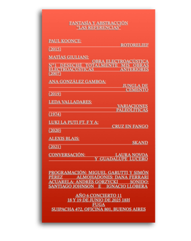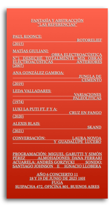 Santiago Johnson: Buenas tardes. Muchas gracias por acercarse a FUGA, este espacio que estamos inaugurando el día de hoy. Vamos a dar comienzo con esta charla junto a Guadalupe Lucero y luego escucharemos el concierto 11 de Fantasía y Abstracción, titulado Las referencias. Empecemos con un interrogante sencillo. ¿De qué habla la música?